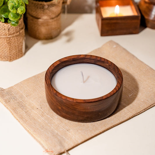 Bring warmth and beauty to your space with Crafiteria’s Wooden Flat Bowl Candles. Handcrafted with care, each candle is poured into a unique wooden bowl made by skilled artisans. These soy wax scented candles are not just eco-friendly but also fill your home with calming, long-lasting fragrance.